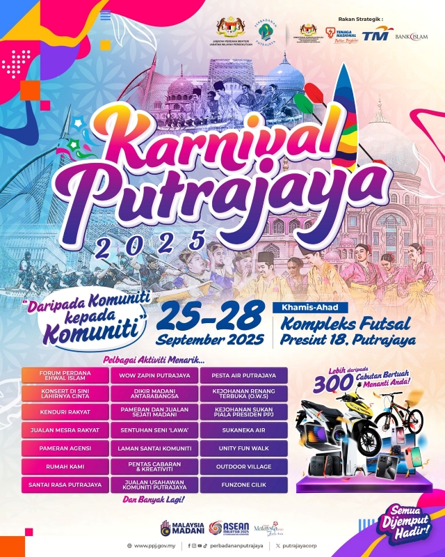 Bertemakan "Daripada Komuniti Kepada Komuniti", Karnival Putrajaya 2025 membabitkan kerjasama erat PPj, Majlis Perwakilan Penduduk (MPP), persatuan penduduk dan NGO Putrajaya dalam merangka lebih 60 aktiviti sepanjang empat hari penganjuran pada 25-28 September 2025.