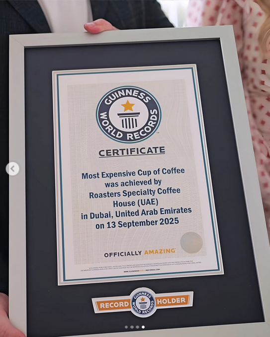 Rekod itu dicatat pada 13 September 2025 lalu di cawangan utama Roasters di Boulevard Downtown, Dubai, apabila seorang pelanggan bertuah disajikan secawan kopi yang dibru menggunakan kaedah V60 dan dihidangkan dalam gelas kristal buatan tangan Edo Kiriko dari Jepun yang terkenal dengan corak artistiknya.