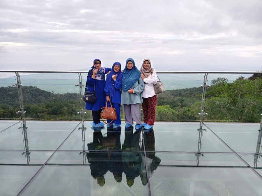 Bergambar di platform kaca, Jerai Skyview sambil melihat pemandangan dari puncak.