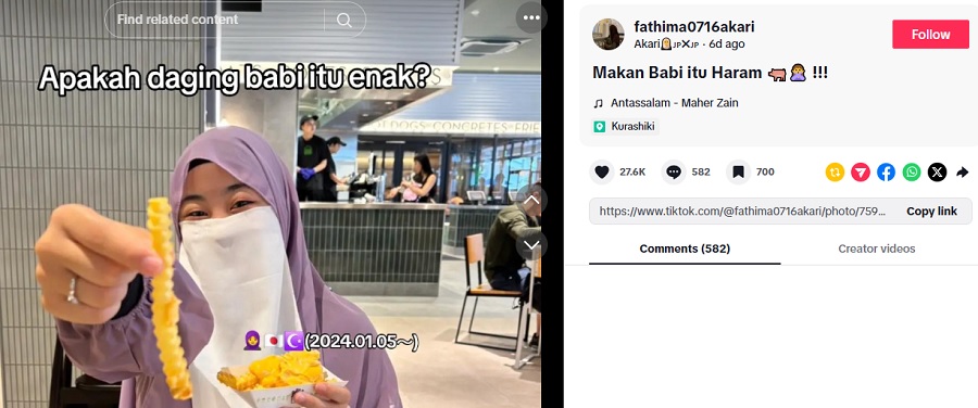 Wanita berkenaan dikenali sebagai Akari, atau nama akaunnya @fathima0716akari, sering berkongsi perjalanan hidupnya sebagai seorang Muslimah di Jepun, sebuah negara yang majoriti masyarakatnya menjadikan daging babi sebagai makanan harian.