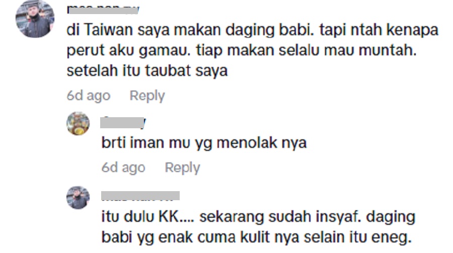 “Di Taiwan saya makan daging babi, tapi entah kenapa perut saya tidak boleh terima. Setiap kali makan, rasa mahu muntah. Selepas itu saya bertaubat,” kongsi salah seorang netizen.