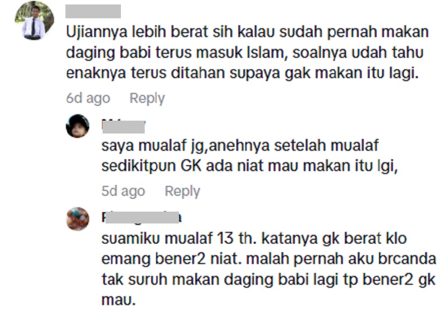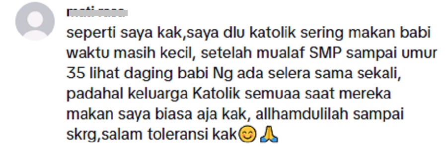 “Saya dulu Katolik, sering makan daging babi waktu kecil. Selepas mualaf sejak SMP sampai umur 35 tahun, melihat daging babi langsung tiada selera.