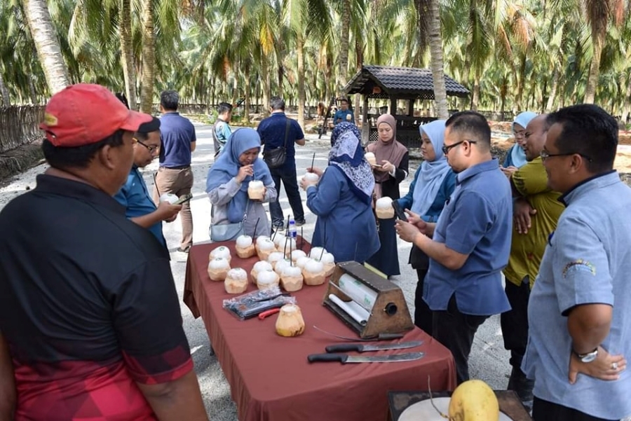 orang ramai melawat kawasan kebun, produk kelapa disediakan untuk dirasai dan