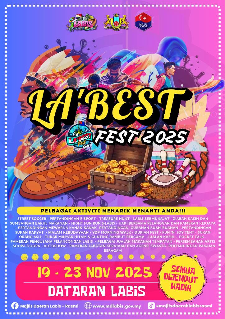 Dataran Labis bakal berubah wajah pada November 2025 ini apabila Majlis Daerah Labis (MDL) menganjurkan La’Best Fest 2025, sebuah karnival komuniti yang menjanjikan empat hari penuh warna, aktiviti dan kemeriahan.