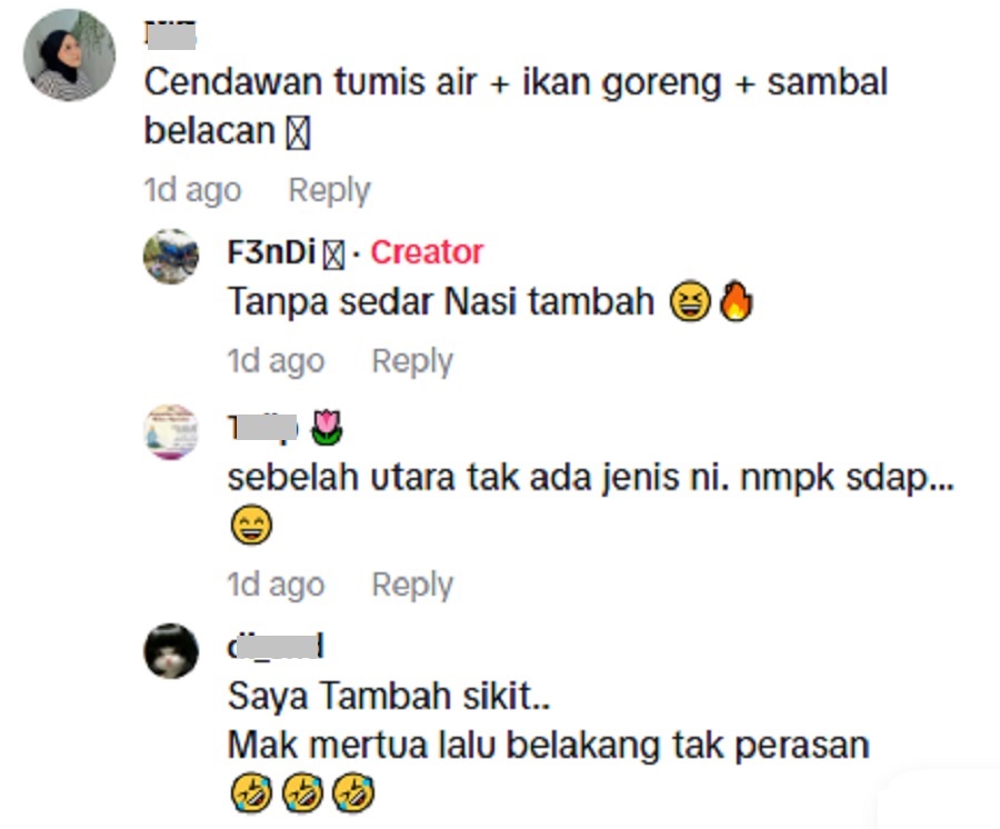 Seorang lagi netizen memuji keenakan menu ringkasnya, “Cendawan tumis air tambah ikan goreng tambah sambal belacan, nasi confirm tambah.”