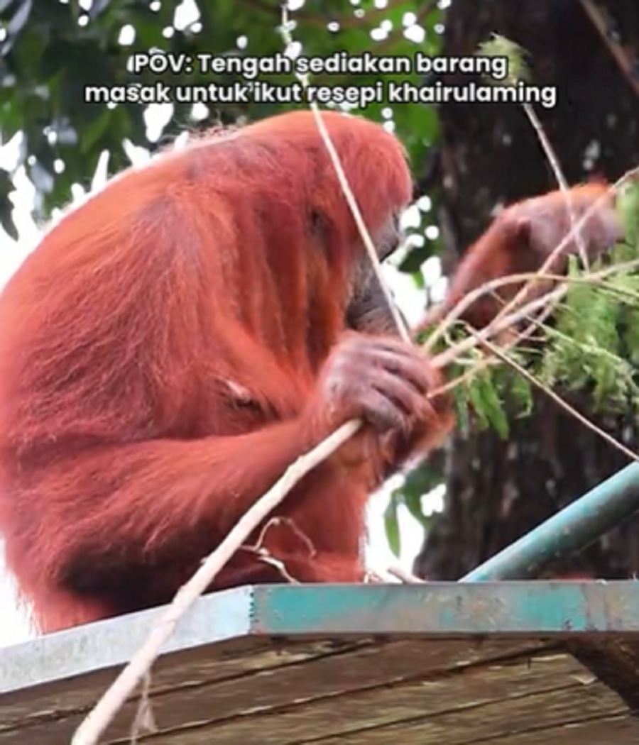 Kapsyen tersebut membuatkan ramai terhibur apatah lagi melihat gelagat orang utan bernama Maya yang sedang sibuk mencarik daun dan mematahkan dahan pokok seperti sedang menyediakan bahan untuk memasak.