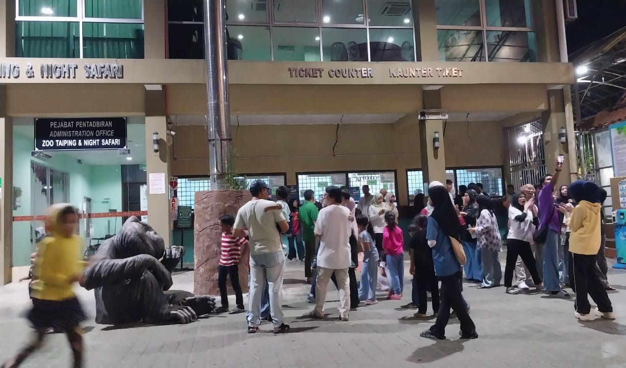 Sebahagian orang ramai yang berkunjung ke Zoo Taiping & Night Safari (ZTNS) beratur untuk membeli tiket memasuki ZTNS pada waktu malam.
