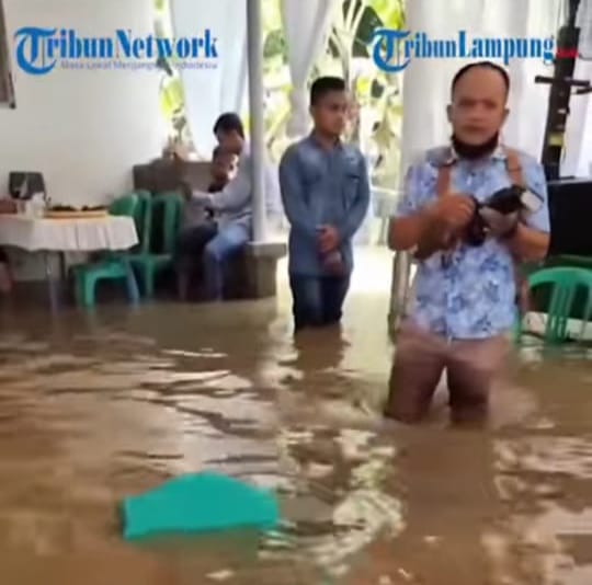 Baru-baru ini, sepasang pengantin yang tidak diketahui nama mereka tinggal di Desa Nusawangkal, Kabupaten Cilacap, Jawa Tengah itu tetap meneruskan acara pernikahan mereka walaupun air bah setinggi lutut orang dewasa di kawasan rumah pengantin.