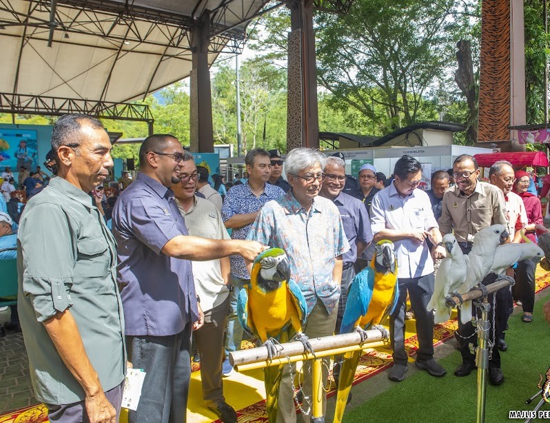 Raja iskandar Dzukarnain Sultan idris (tengah) melihat beberapa ekor burung yang dipamerkan di Pavillion Zoo Taiping & Night Safari di Taiping.