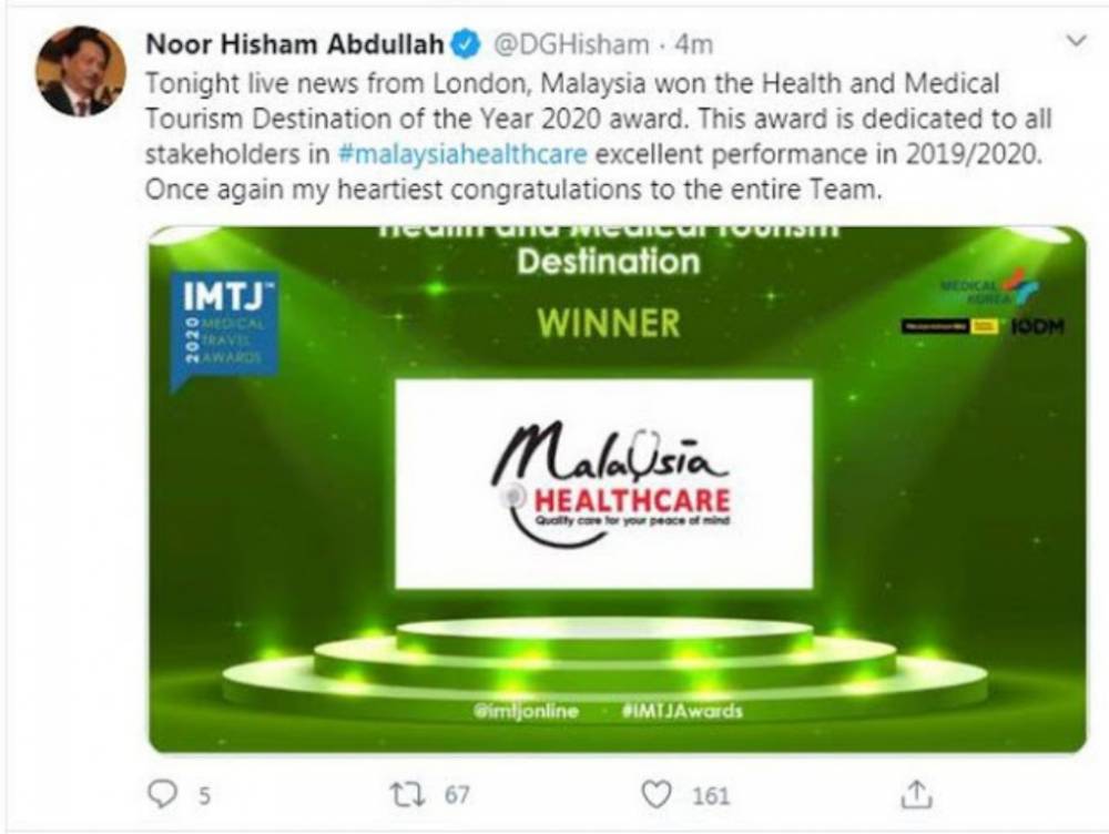 Ini memperkasakan lagi kedudukan Malaysia sebagai Pusat Penjagaan Kesihatan Mengagumkan Di Dunia (World’s Healthcare Marvel) dan mencerminkan komitmen teguh daripada organisasi berkaitan bagi memastikan kesinambungan daripada sektor Penjagaan Kesihatan Malaysia ketika pandemik COVID-19.