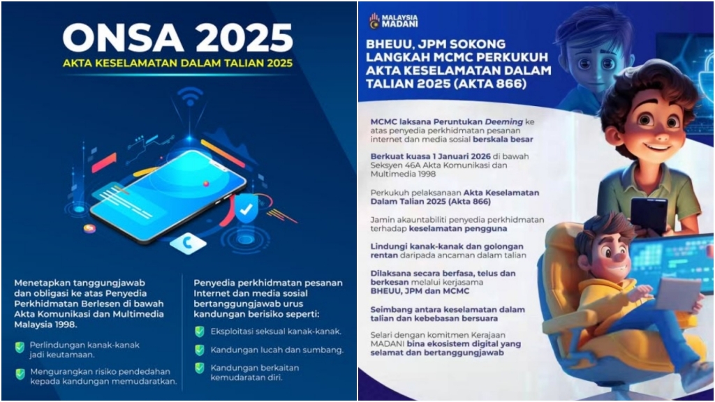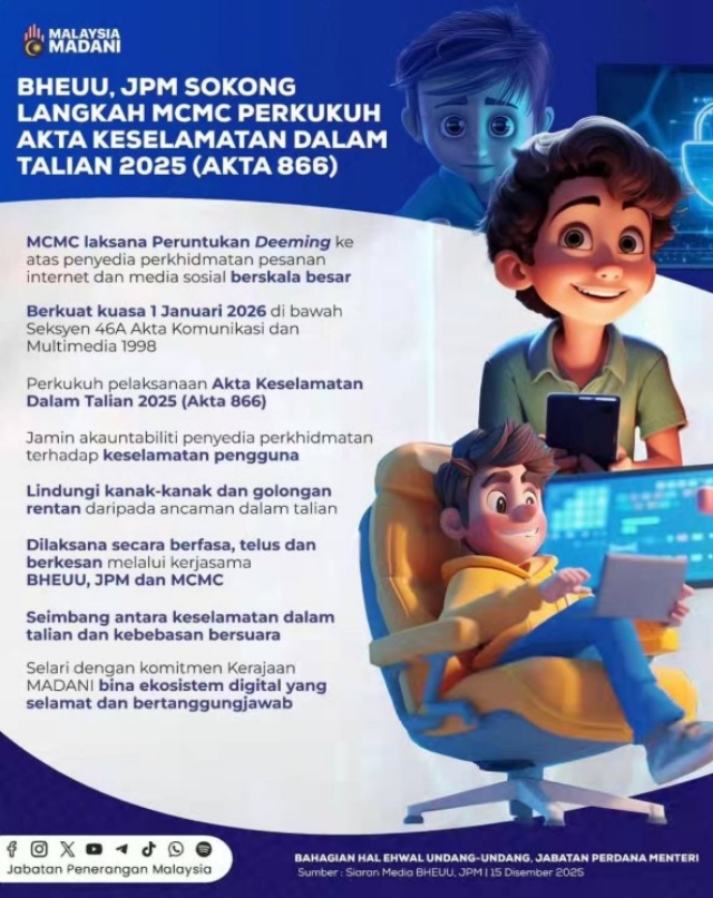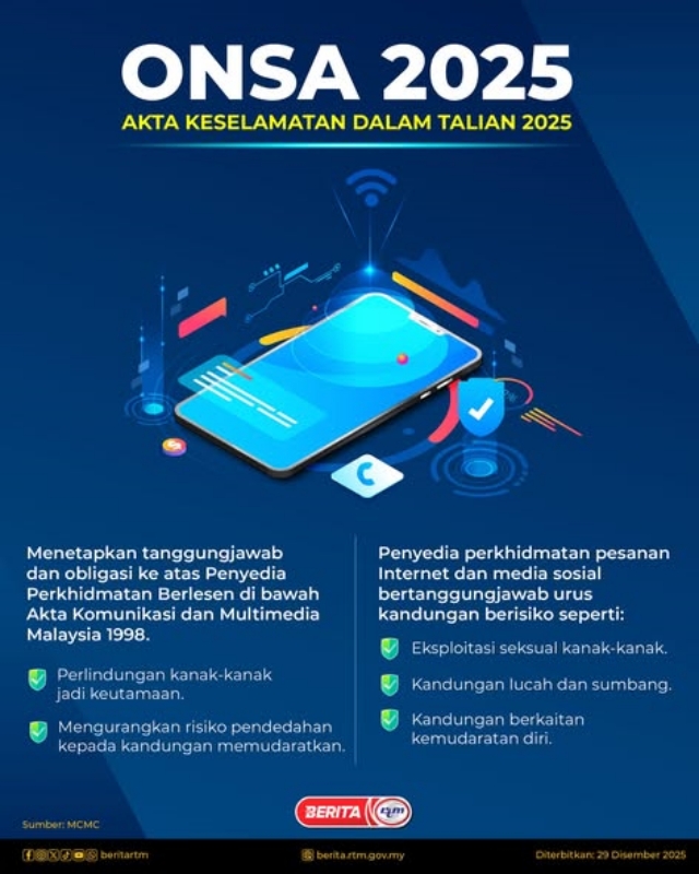 Suruhanjaya Komunikasi dan Multimedia Malaysia (MCMC) hari ini, 1 Januari 2026, mengumumkan penguatkuasaan Akta Keselamatan Dalam Talian 2025 (ONSA), yang menggariskan kerangka perundangan bagi meningkatkan keselamatan dalam talian serta memperkukuh perlindungan terhadap pengguna, khususnya kanak-kanak dan keluarga.