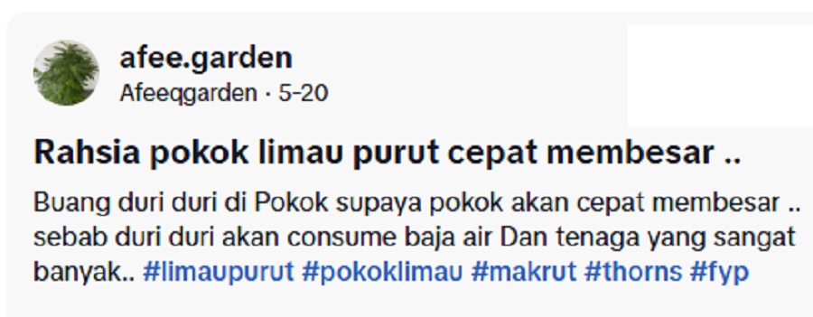 Menyentuh bab tanaman ini, penulis tertarik dengan satu perkongsian oleh seorang individu dikenali sebagai Afeeq Garden mengenai cara atau tip agar pokok limau purut membesar dengan jayanya.