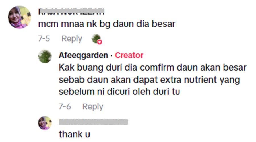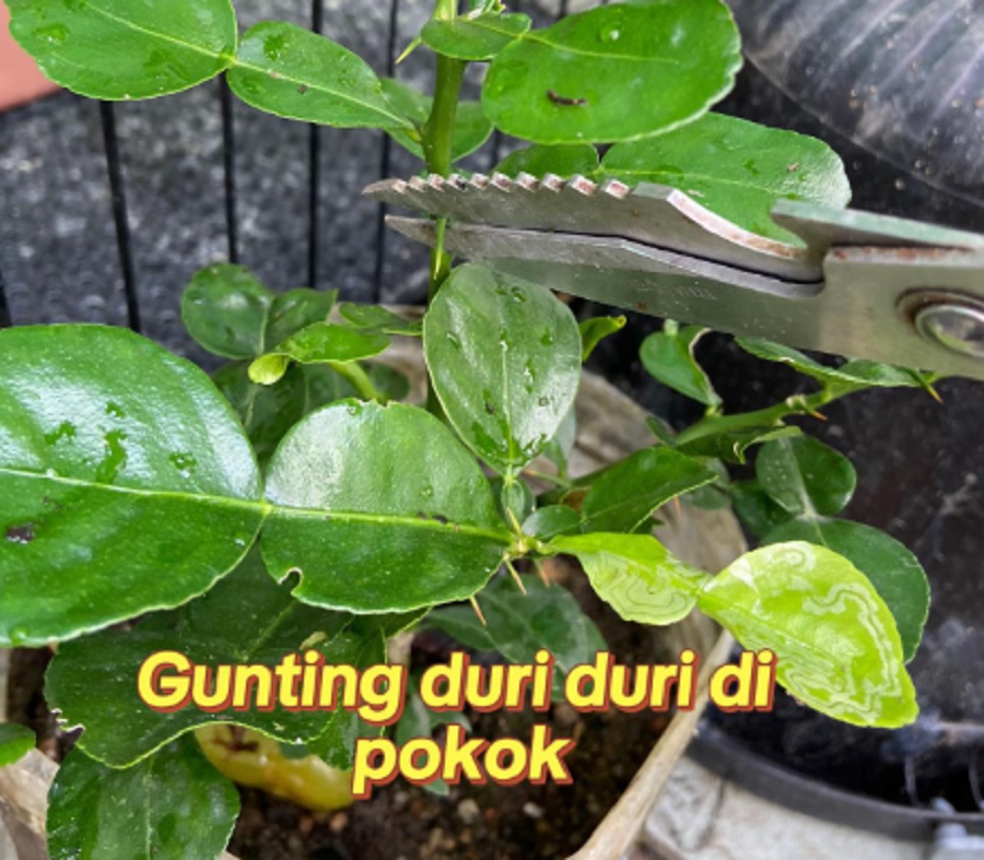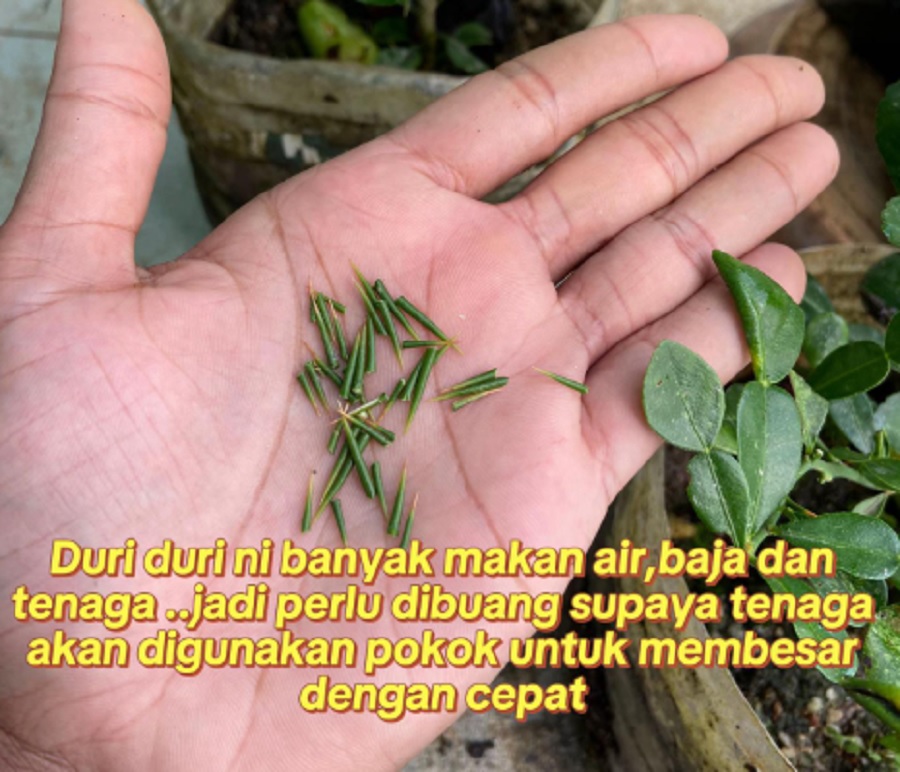 âBuang duri-duri di pokok supaya pokok akan cepat membesar. Ini kerana duri-duri akan memakan baja, air dan tenaga yang sangat banyak,â kongsinya.