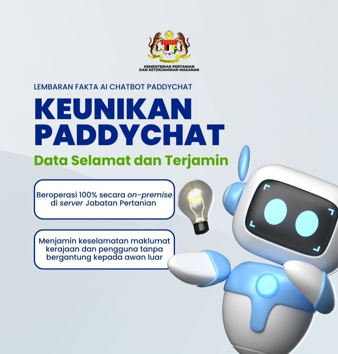 Menurut DOA lagi, PaddyChat dibangunkan menggunakan server dalaman kerajaan dan tidak bergantung kepada sistem awan luar, sekali gus menjamin keselamatan data pesawah dan maklumat strategik negara.